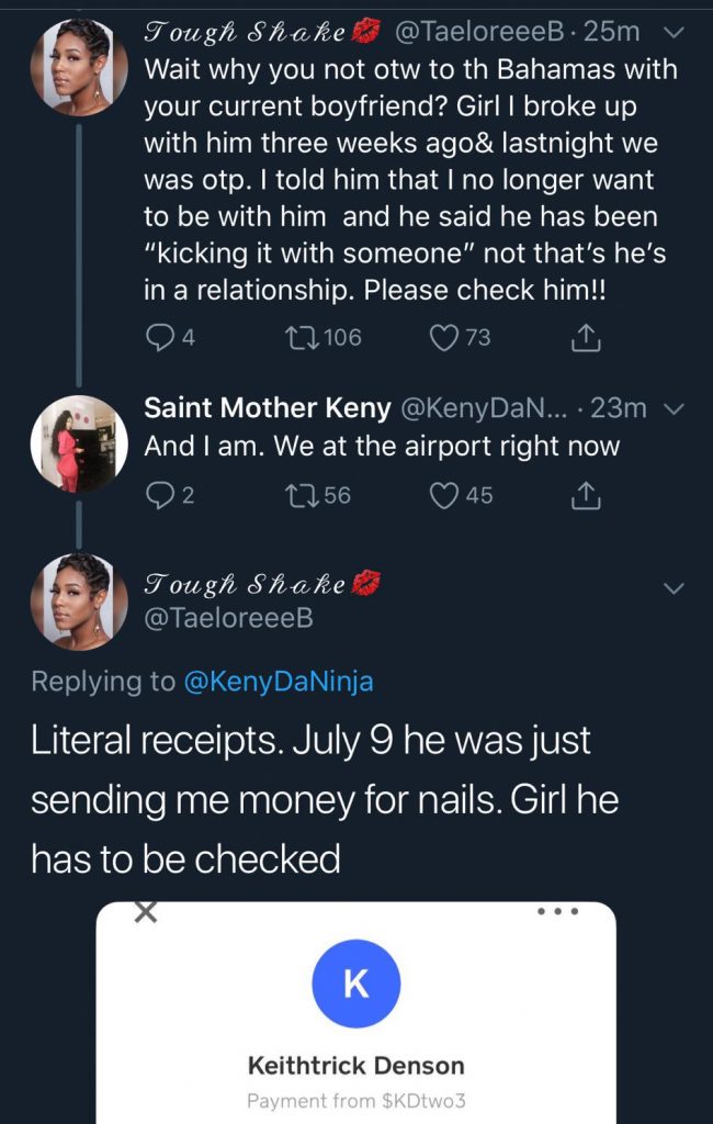 5. Auw. De ene vrouw zegt dat ze het drie weken geleden hebben uitgemaakt maar dat ze elkaar gisteren nog hebben gezien. Ze stuurt een screenshot van een bankafschrift om dat te bewijzen. De andere vrouw is dus met hem op het vliegveld op weg naar de Bahama’s.