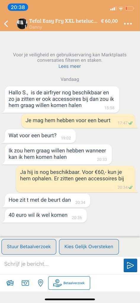 Heel soms vergeten we even dat er meerdere mensen bestaan met dezelfde naam. Zo ook deze vrouw. Ze had een airfryer op Marktplaats te koop gezet en kreeg reactie van een koper met de naam Danny. Toevallig heet haar vriend ook zo en dus denkt ze dat hij haar in de maling neemt. Alleen blijkt deze Danny een koper met oprechte interesse in de friteuse. De zus van de vrouw plaatst het gesprek op Twitter.