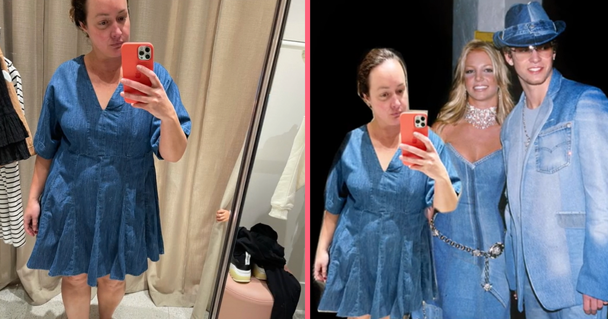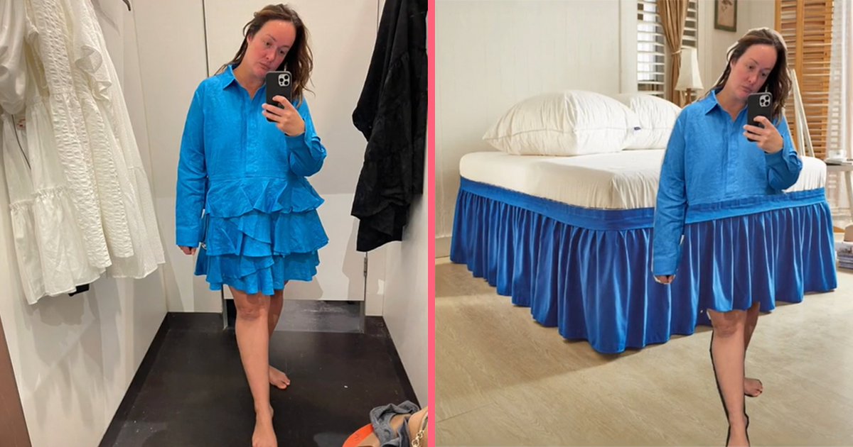 2. Zo lieten de plooien van deze blauwe jurk haar man denken aan een bedrok, en we moeten zeggen: ze blendt wel goed in.