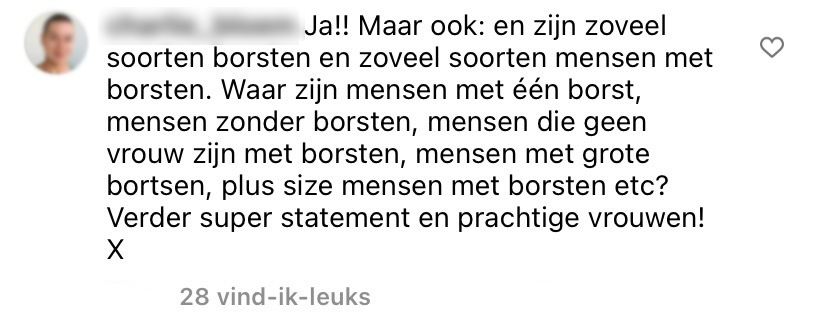 “Wij snappen de vraag om diversiteit op onze nieuwste cover. We hebben heel veel vrouwen met verschillende maten gevraagd voor de covershoot. En deze vrouwen waren zo stoer om ja te zeggen. In het nummer staan nog meer verschillende borsten. We vinden het jammer dat de discussie op social media nu hierover gaat, terwijl wij de boodschap van deze editie zo belangrijk vinden. Normalisering van vrouwenborsten in plaats van seksualisering.” “Aangejaagd door sociale media als Instagram, dat vrouwentepels censureert maar mannentepels ongemoeid laat, waait er een nieuwe, preutse wind door de maatschappij. We leven in een wereld waarin vrouwen die in het openbaar borstvoeding geven daar onaardig commentaar op krijgen en je bij een diep decolleté te verstaan wordt gegeven dat je dan ook wel om ongewenste avances vraagt.” Dus houdt Karin een pleidooi voor borsten: “Onze borsten zijn van ons en alleen wij zouden moeten bepalen of en wanneer we die tonen.”