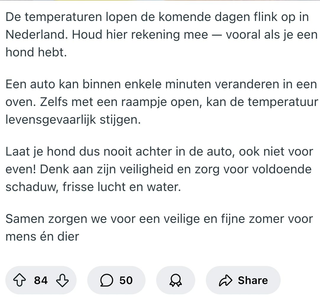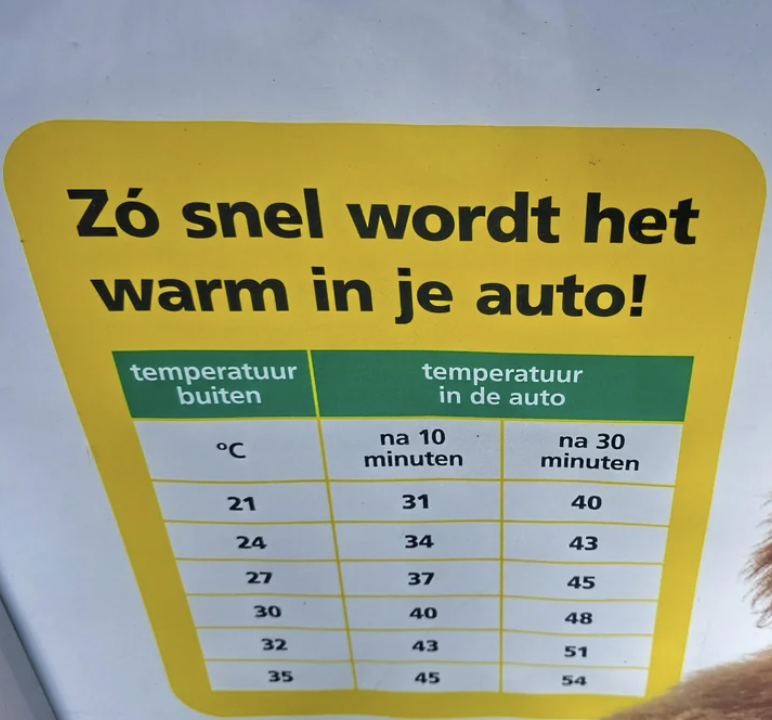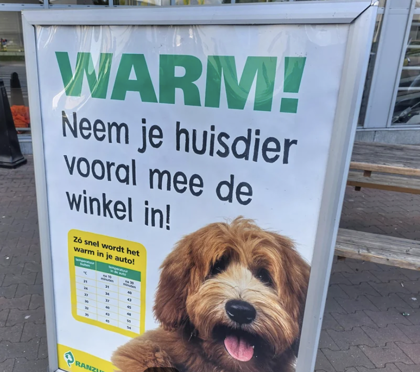 Hoewel veel Nederlanders blij zijn dat het warme weer weer voor de deur staat, geldt dat niet voor hun huisdieren. Met hun dikke vacht en beperkte mogelijkheden om af te koelen, hebben ze het snel warm. Al helemaal in een afgesloten auto. En toch zijn er nog altijd baasjes die hun huisdier daar zonder pardon in achterlaten. Dit tuincentrum grijpt in met een duidelijk bord voor alle baasjes, en daar staan veel mensen hond-erd procent achter.