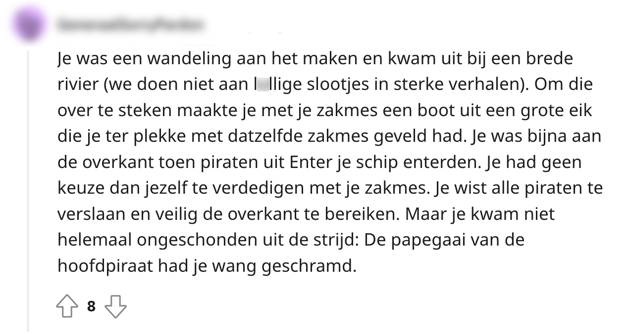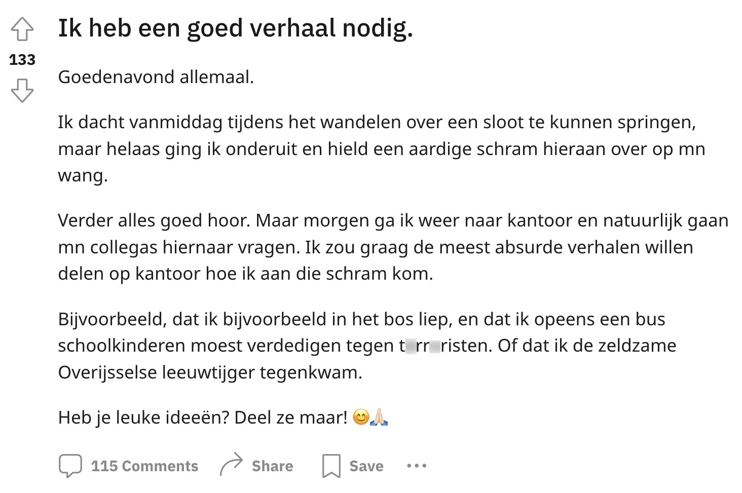 Wanneer je een onnozele blunder begaat, verdwijn je het liefst van de aardbodem. In de meest ideale situatie heeft niemand dit voorval gezien en kan je verder gaan alsof er nooit iets is gebeurd. Maar wat als je er bijvoorbeeld verwondingen aan over hebt gehouden? Leg dan maar eens aan vrienden, familie en collega’s uit hoe onhandig je bent geweest. Op Reddit vraagt iemand die in zo’n situatie is beland om hulp. Deze persoon heeft een schram opgelopen tijdens een wandeling, maar wil aan collega’s liever een spannend verhaal vertellen. Gelukkig komen mensen al snel met de meest creatieve smoesjes.