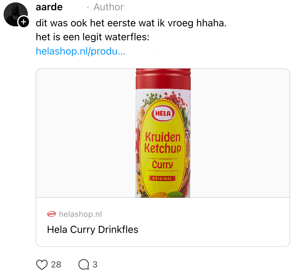 De afgelopen jaren hebben we veel verschillende soorten waterflessen gezien. Het begon met de VSCO girls en hun Hydro Flasks en recenter kan je niet meer om de gigantische Stanley cups heen. Maar naast de populaire merken zijn er nog veel meer unieke flessen. De vriendin van deze Threads-gebruiker heeft een erg bijzondere waterfles en andere Nederlanders kunnen er met hun hoofd niet bij.