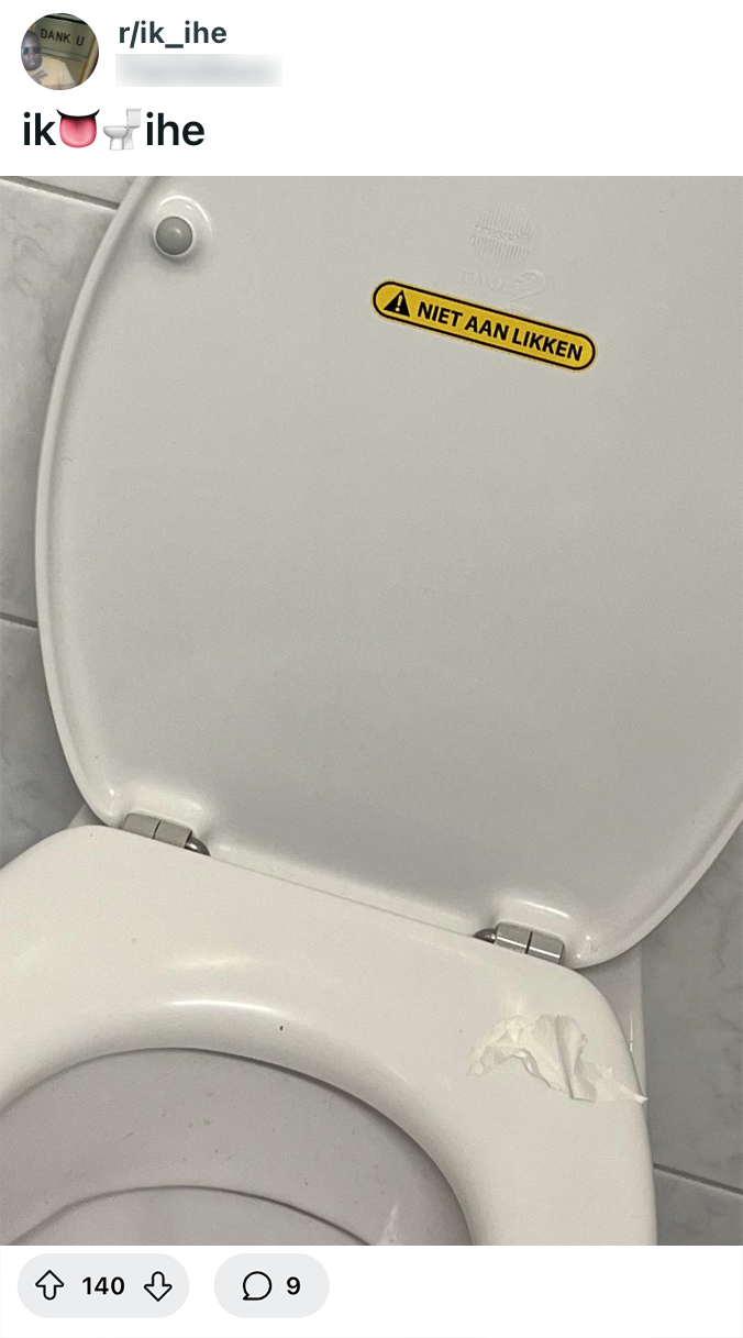 Vraag je iemand naar z’n favoriete toilet, dan kiezen de meesten voor hun eigen porseleinen troon. Logisch, want daar brandt namelijk een lavendelkaarsje, je weet precies wanneer-ie voor laatst geboend is en hebben geen onbekende billen de bril aangeraakt. Toch dwingt hoge nood je soms tot een openbaar hokje. Zo betreedt ook deze Reddit-gebruiker een openbaar toilet. Diegene opent de deur en stuit op een sticker met een opvallend verbod. En je weet wat ze zeggen: zo’n verbod hangt er nooit zonder reden.