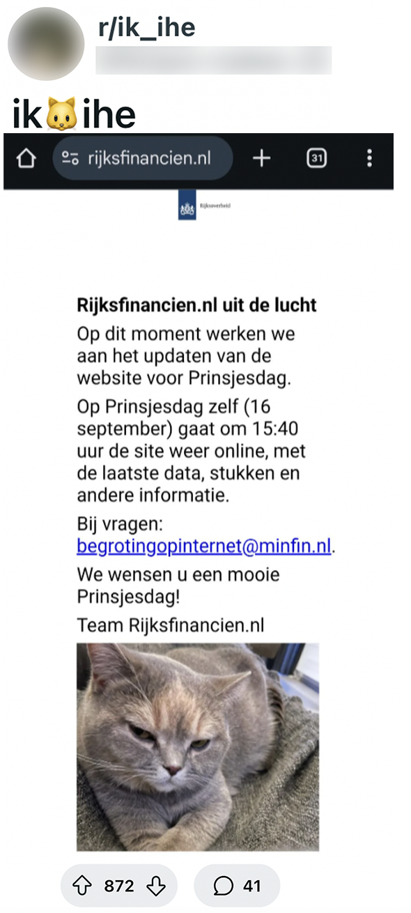 Gisteren was het weer zover: Prinsjesdag. Politici paradeerden met extravagante hoedjes, de koning liet zich rondrijden in de Glazen Koets en Nederlanders vonden opnieuw redenen om te klagen over de belastingplannen voor het komende jaar. Een dag vol traditie en spektakel, maar ook eentje waarop websites razendsnel moeten worden bijgewerkt met de nieuwste kabinetsplannen. In verband met de wijzigingen op de site kregen bezoekers van het Ministerie van Financiën in plaats van de verwachte begroting ineens iets héél anders voorgeschoteld.