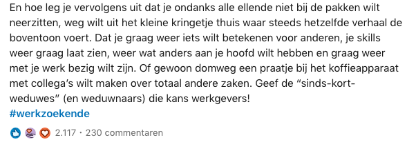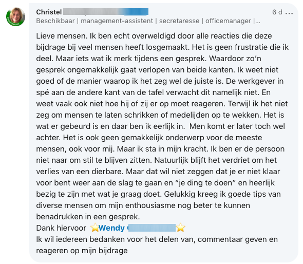 Je partner verliezen is onbeschrijfelijk moeilijk en verdrietig. De eerste periode is werk waarschijnlijk het laatste waar je aan denkt. Maar na een tijdje heb je misschien langzaam wel de behoefte om weer aan het werk te gaan. Maar hoe breng je jouw weduwnaarschap tijdens een sollicitatiegesprek ter sprake? En schrikt het werkgevers niet enorm af? Christel deelt haar persoonlijke verhaal op LinkedIn.