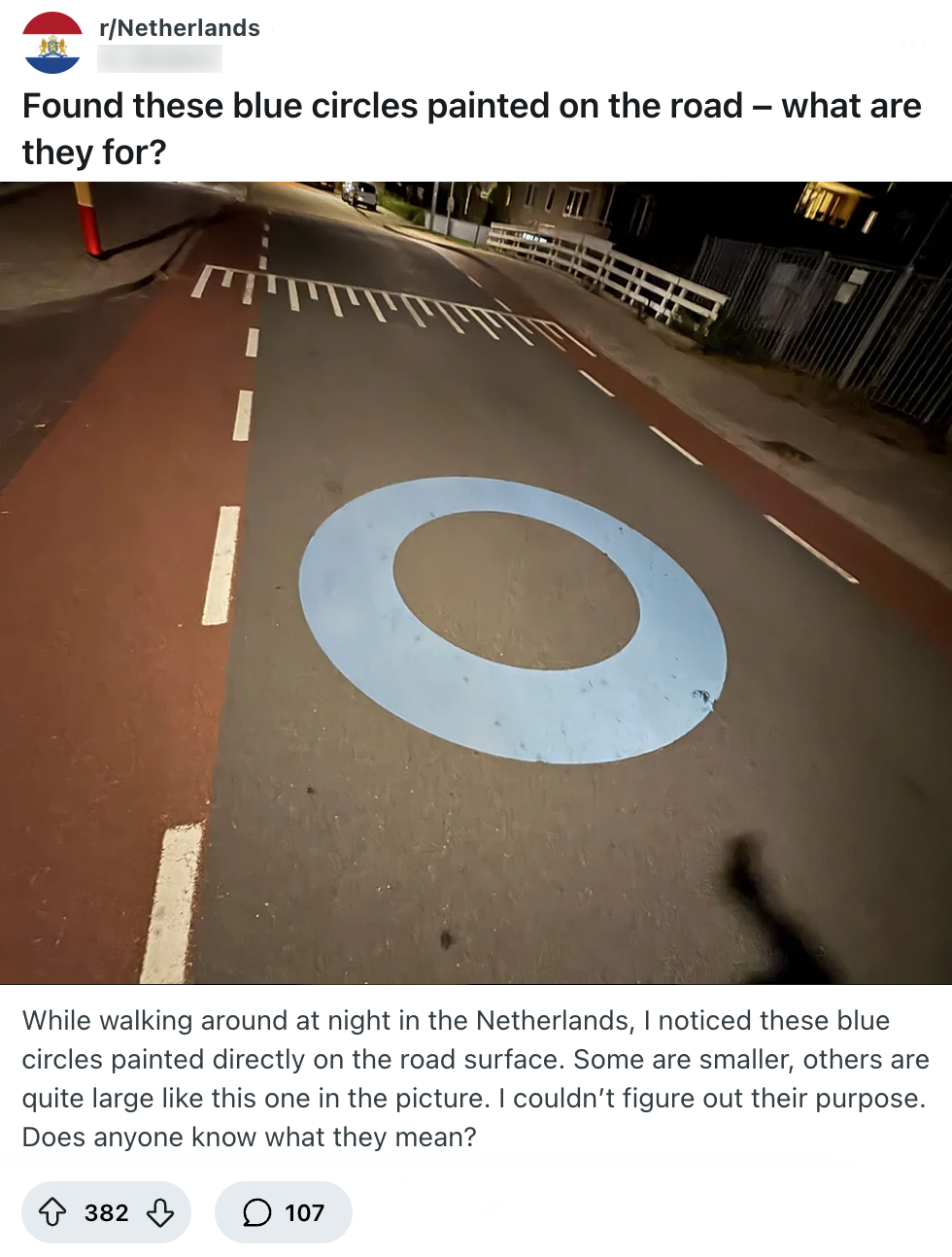 Als je over straat rijdt, zie je zoveel verschillende verkeersborden en tekens dat ze op een gegeven moment je neus uitkomen. Je weet nu inmiddels wel dat je bij haaientanden voorrang moet geven en bij een rode driehoek moet oppassen voor allerlei dingen. Maar soms kom je tekens tegen waardoor je jezelf effe achter de oren moet krabben. Deze Reddit-gebruiker stuit op mysterieuze cirkels op straat en vraagt zich af wat de betekenis erachter is. Gelukkig weten andere Nederlanders daar wel raad mee.