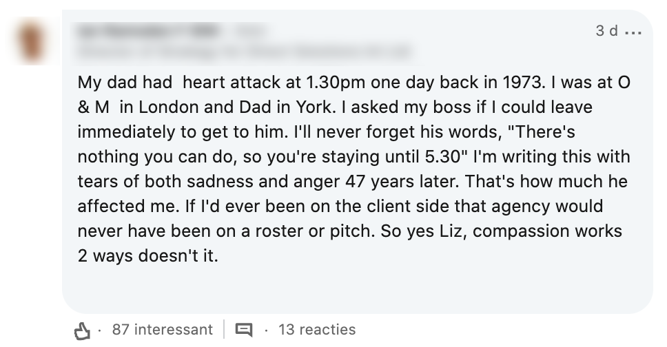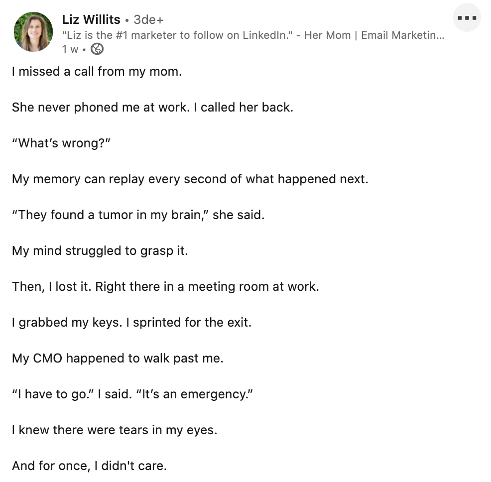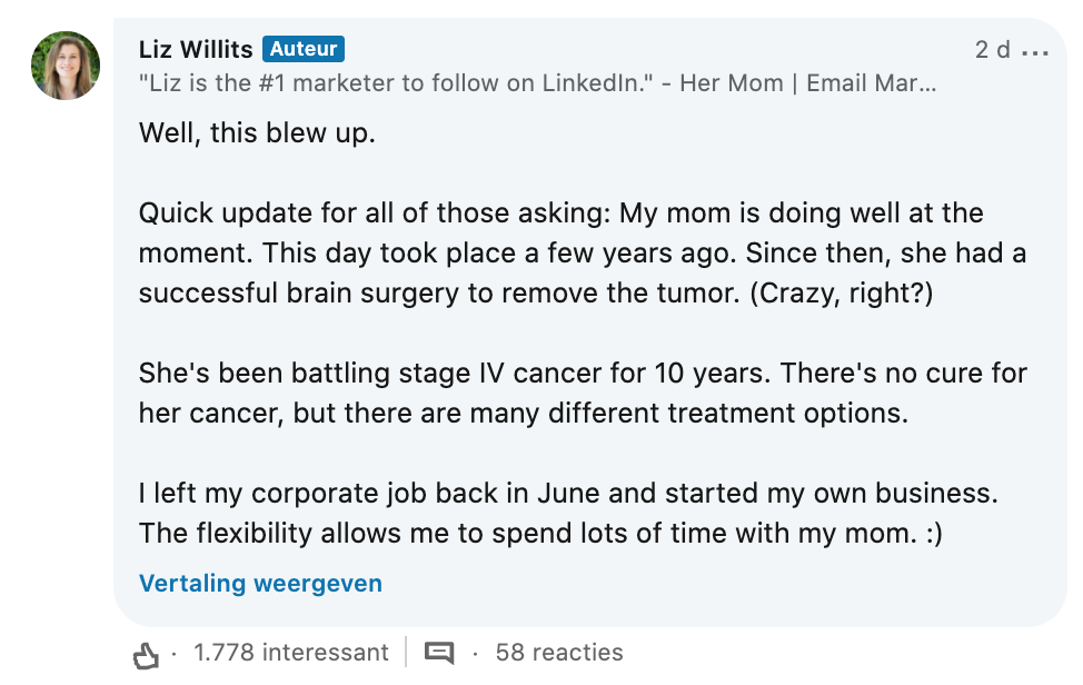 1. Liz deelt haar verhaal via LinkedIn. Het begint met het telefoontje van haar moeder.