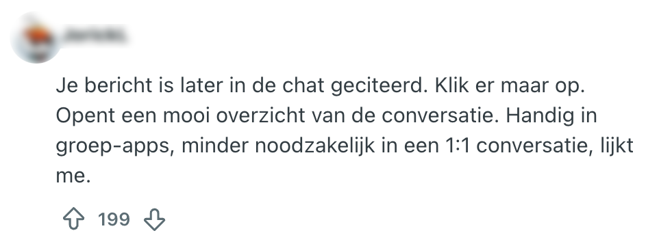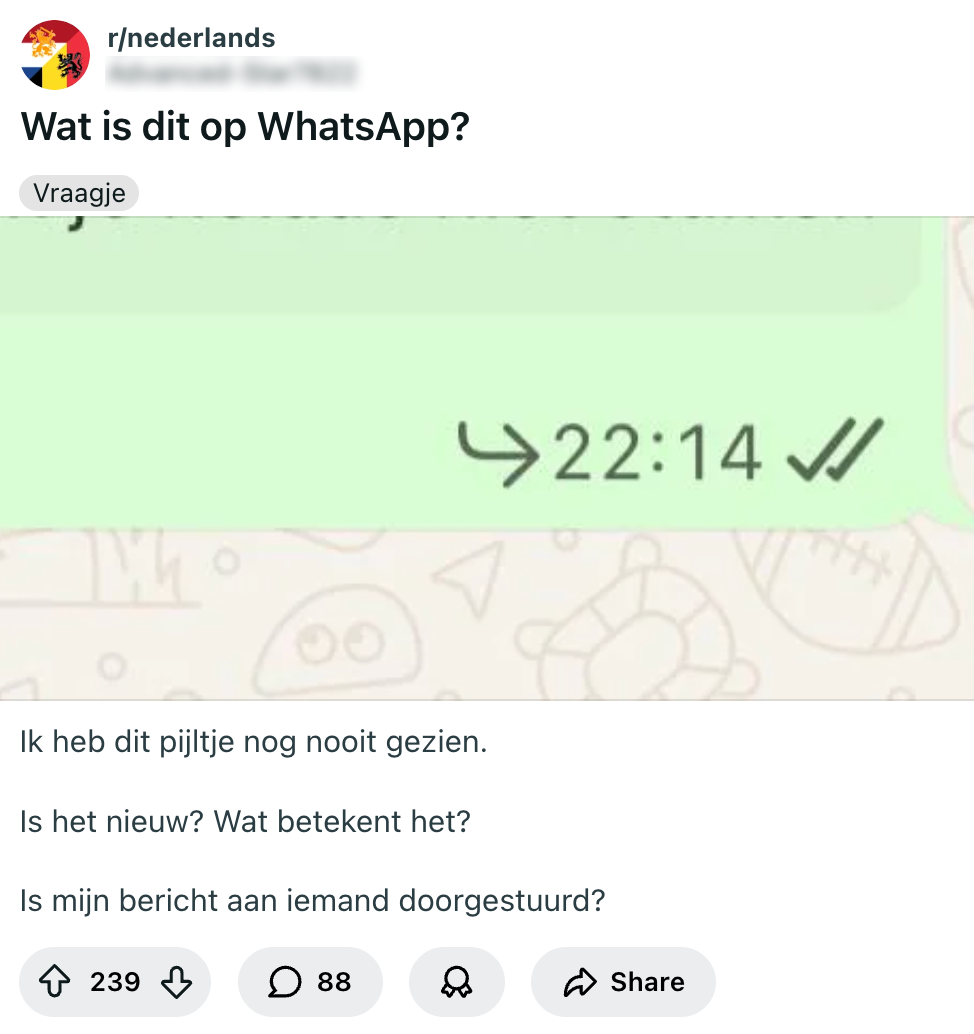 De meeste Nederlanders kijken waarschijnlijk vaker naar hun WhatsApp-gesprekken dan naar hun bloedeigen familie. Als er ineens iets verdwijnt of juist verschijnt in de app, valt dat dan ook meteen op. Zelfs met één minuscuul pijltje dat alleen verschijnt als je een bericht hebt verstuurd, komt WhatsApp niet zomaar weg. Deze Reddit-gebruiker ontdekte namelijk een kleine verandering en richt daar online zijn pijlen op. Na deze bevinding kunnen anderen niet anders dan speculeren over wat het zou kunnen betekenen.