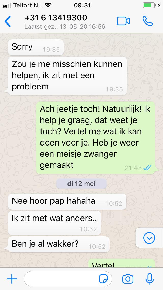 We schreven al vaker over WhatsApp oplichting. Gelukkig hebben steeds meer mensen het meteen door. En nog gelukkiger voor ons, spelen er steeds meer mensen mee en maken ze screenshots. Daan liet eerder Twitter al meestemmen over de antwoorden. Maar het lukte Viktor zelfs om de oplichter echt heel lang aan het (honden)lijntje te houden. Hij beheert de telefoon van z’n vader en dus kwamen de berichten rechtstreeks bij hem binnen.
