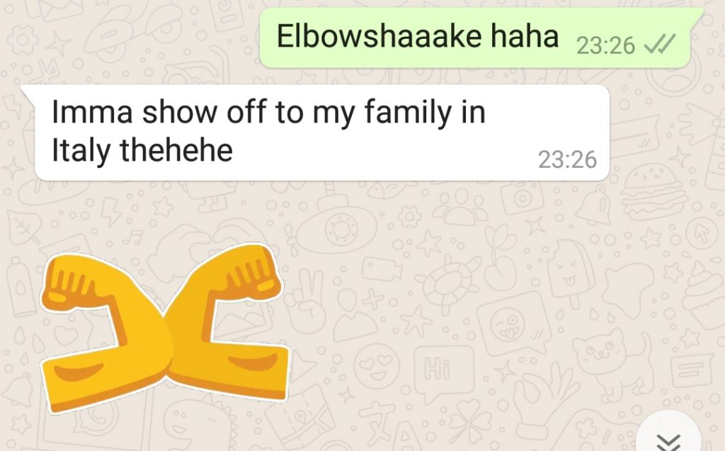 Nu we elkaar de hand niet meer mogen schudden van premier Rutte en onze heil moeten zoeken in elleboogboks, vond Jason Fredrick het tijd om ook het digitale assortiment in begroetingen uit te breiden. En wel met een elleboog-begroetingssticker.