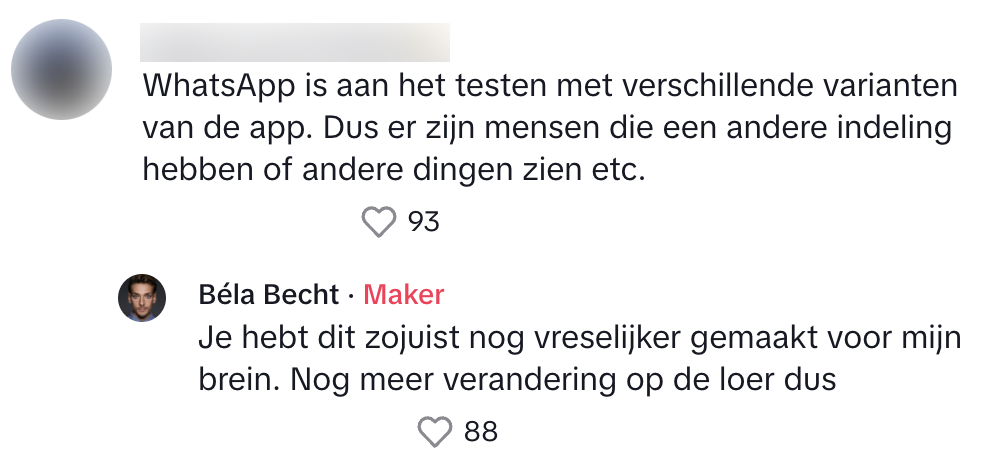 Een hoop Nederlanders zien het beginscherm van WhatsApp vaker dan hun eigen familie. Dus wanneer er opeens iets verandert in de app, valt dat direct op. Zelfs met slechts één andere letter of nieuwe kleur komt WhatsApp niet zomaar weg. Béla ontdekt een ontiegelijk kleine verandering in z’n chats en die bezorgt hem (met een flinke korrel zout) slapeloze nachten. Hij deelt dit bericht in een video op social media en al snel blijkt hij niet de enige te zijn die deze update direct weer zou willen deleten.