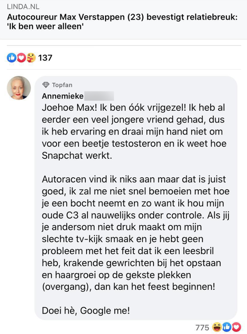6. En om het geheel even af te sluiten, Verstappen is single en Annemieke laat er geen gras over groeien.