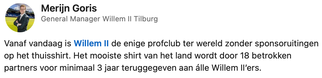 Voetbalspelers worden tegenwoordig voor absurde bedragen gekocht. Waar vijftig jaar geleden ‘maar’ 1,4 miljoen gulden werd betaald voor voetbalicoon Johan Cruijff, wordt er nu zonder blikken of blozen meer dan honderd miljoen euro neergelegd voor een speler die zichzelf nog moet bewijzen. Voetbalclubs moeten veel meer geld binnenhalen, dus staan alle tenues tegenwoordig vol met sponsorlogo’s van bedrijven die daar grof voor betalen. Willem II wil daar verandering in brengen en heeft als eerste profclub ter wereld een thuisshirt met hoofdsponsors, maar zonder uitingen uitgebracht. En daar scoren ze punten mee.