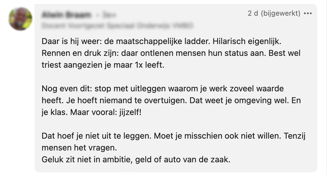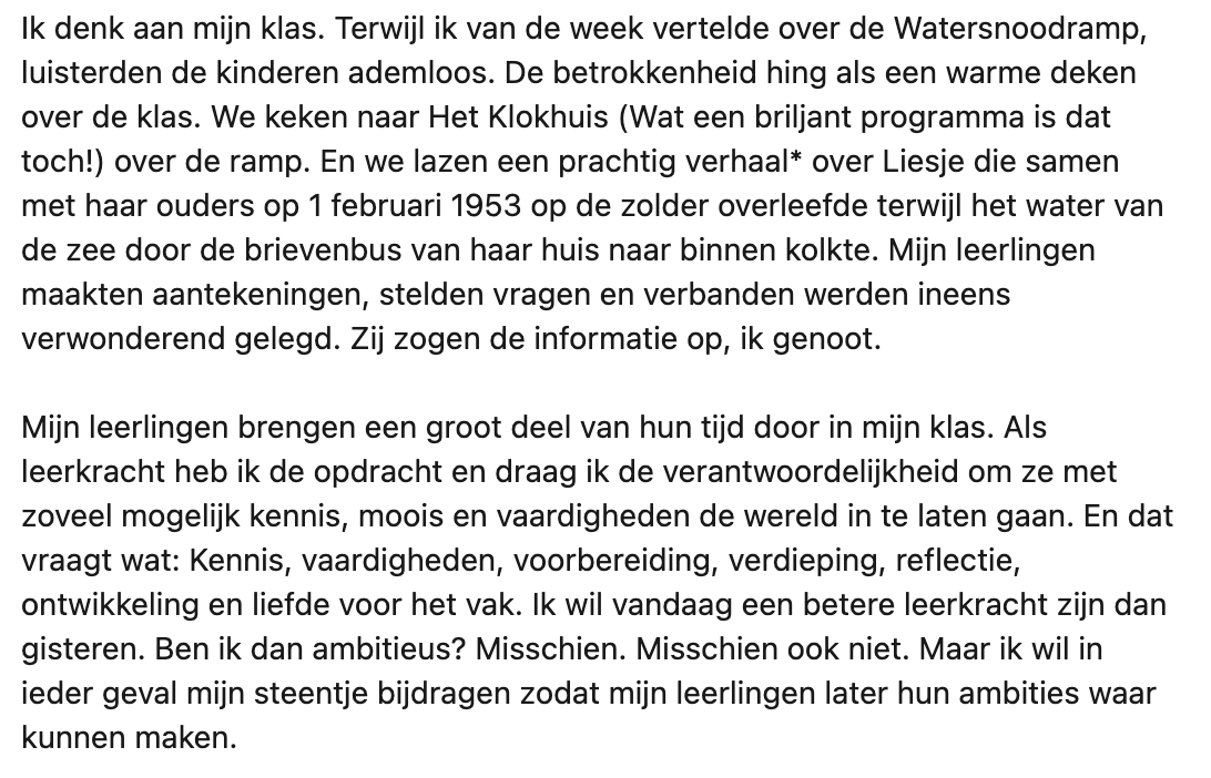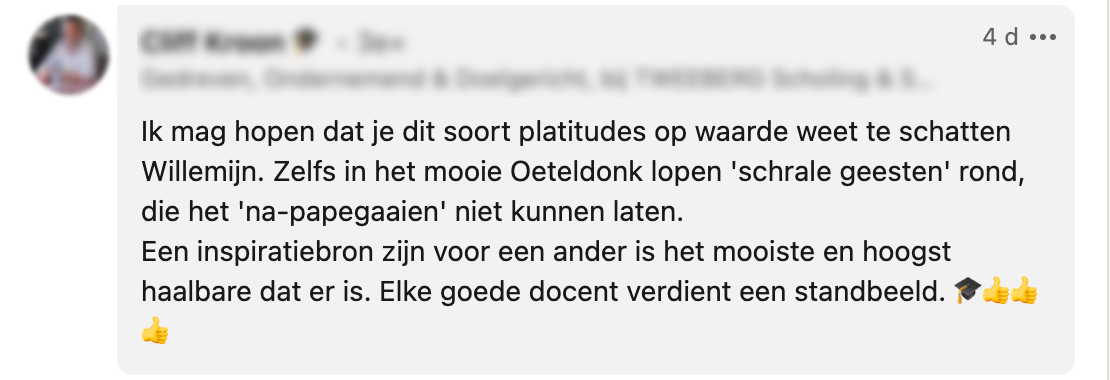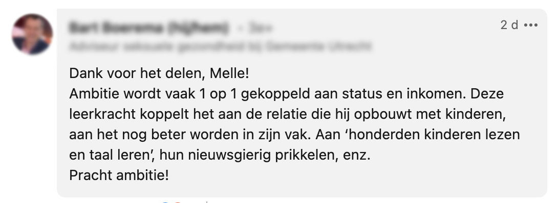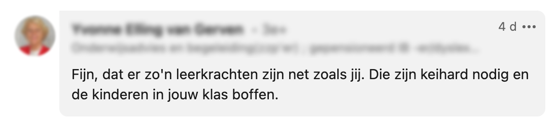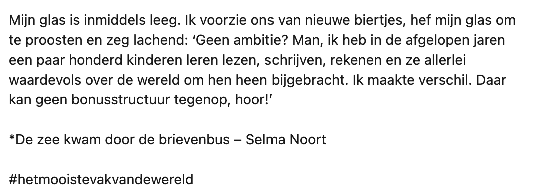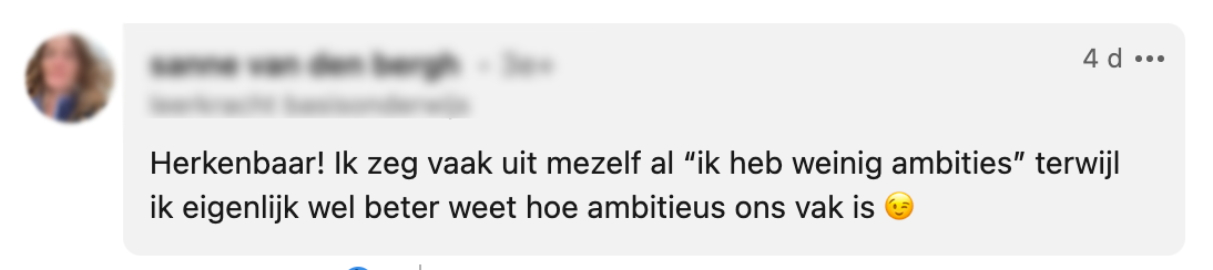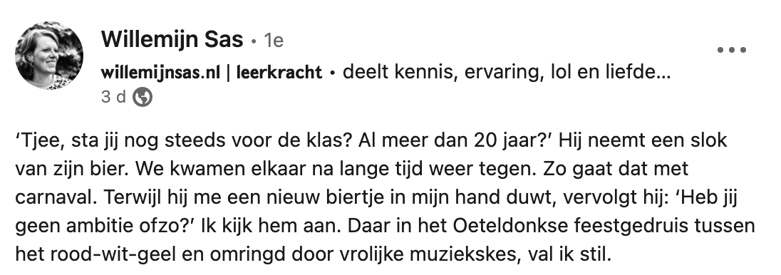 Nadat Willemijn werd gevraagd ‘of ze geen ambitie heeft’ omdat ze na 20 jaar nog steeds voor de klas staat, viel ze even stil. Maar dat liet ze haar niet twee keer vragen. Op LinkedIn neemt ze ons mee in de conversatie. En geloof ons: haar antwoord verdient een dikke 10.