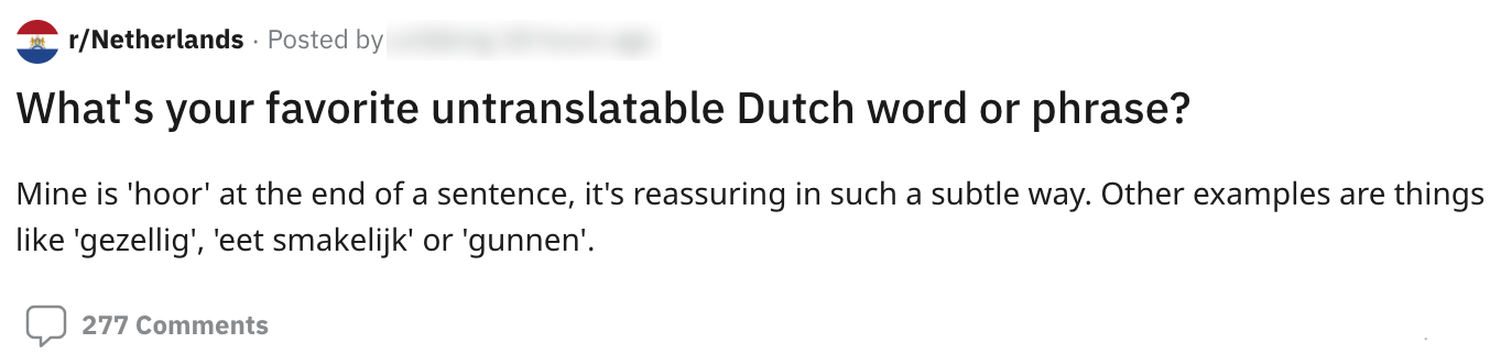 Van ‘aju paraplu’ tot ‘sterkte’: sommige woorden zijn typisch Nederlands, zo ontdekken we als we als we ze proberen te vertalen. Nederlands is al geen appeltje-eitje om te leren, maar door deze woorden wordt het nog lastiger om onze taal onder de knie te krijgen. Precies de reden waarom deze Redditor op zoek ging naar de favoriete niet vertaalbare Nederlandse woorden van anderen.