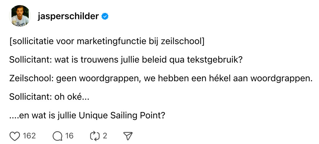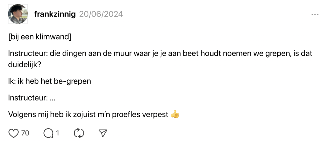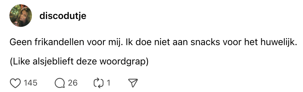 Iedereen kent wel die ene persoon die geen kans mist om een woordgrap te maken bij elke gelegenheid. Sta je op een uitvaart om een laatste eerbetoon aan een familielid te geven, hoor je je oom (die zijn emoties alleen kan uiten met flauwe humor) hardop zeggen: “Hij liet zich nooit kisten, tot aan vandaag hahaha!” En als je die persoon niet kent… dan ben je het waarschijnlijk zelf. Het lijkt erop dat heel wat Nederlanders hun taal-ent hebben ontdekt in 2024, dus we hebben de allerbeste woordgrappen van het afgelopen jaar effe voor je op een rijtje gezet.