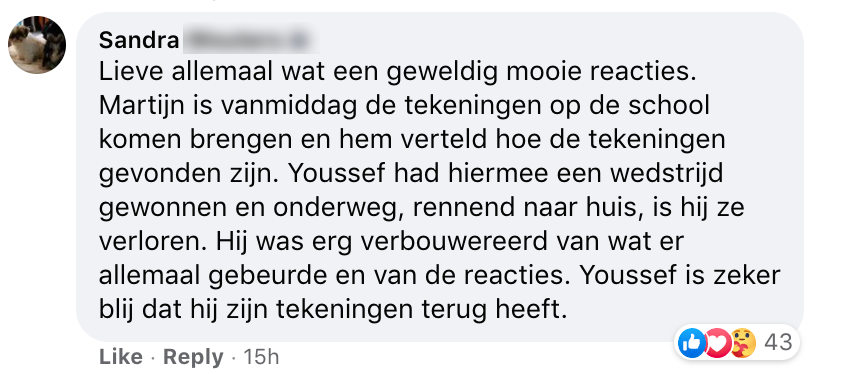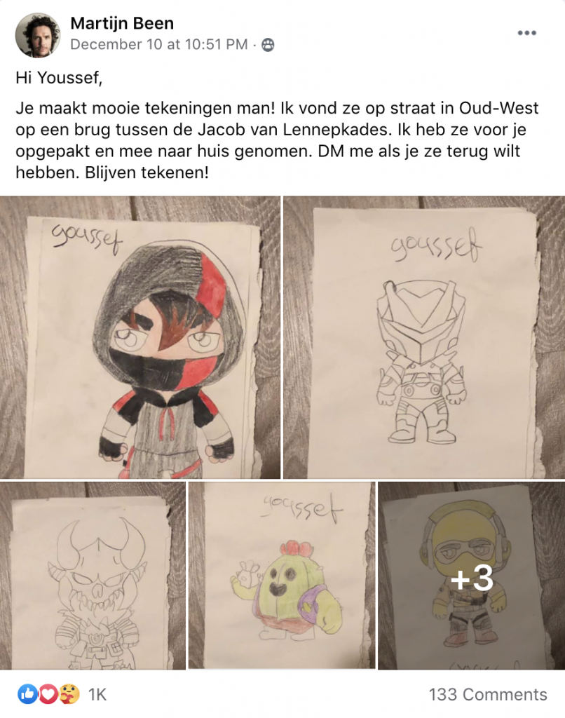 De afgelopen jaren zijn veel mensen gestopt met het gebruiken van Facebook. Ze zouden meer nadelen zien dan voordelen, en daarom verwijderden veel mensen hun account. Maar gelukkig gebeuren er nog regelmatig dingen op het platform waardoor je beseft dat het toch wel erg handig is. Zo vond Martijn afgelopen week een stapeltje tekeningen op straat. Via de Facebook groep ‘Amsterdam Durft te Vragen’ wist hij de 11-jarige Youssef op te sporen en de tekeningen terug te geven. Maar hij was zo onder de indruk dat hij het daar niet bij liet.