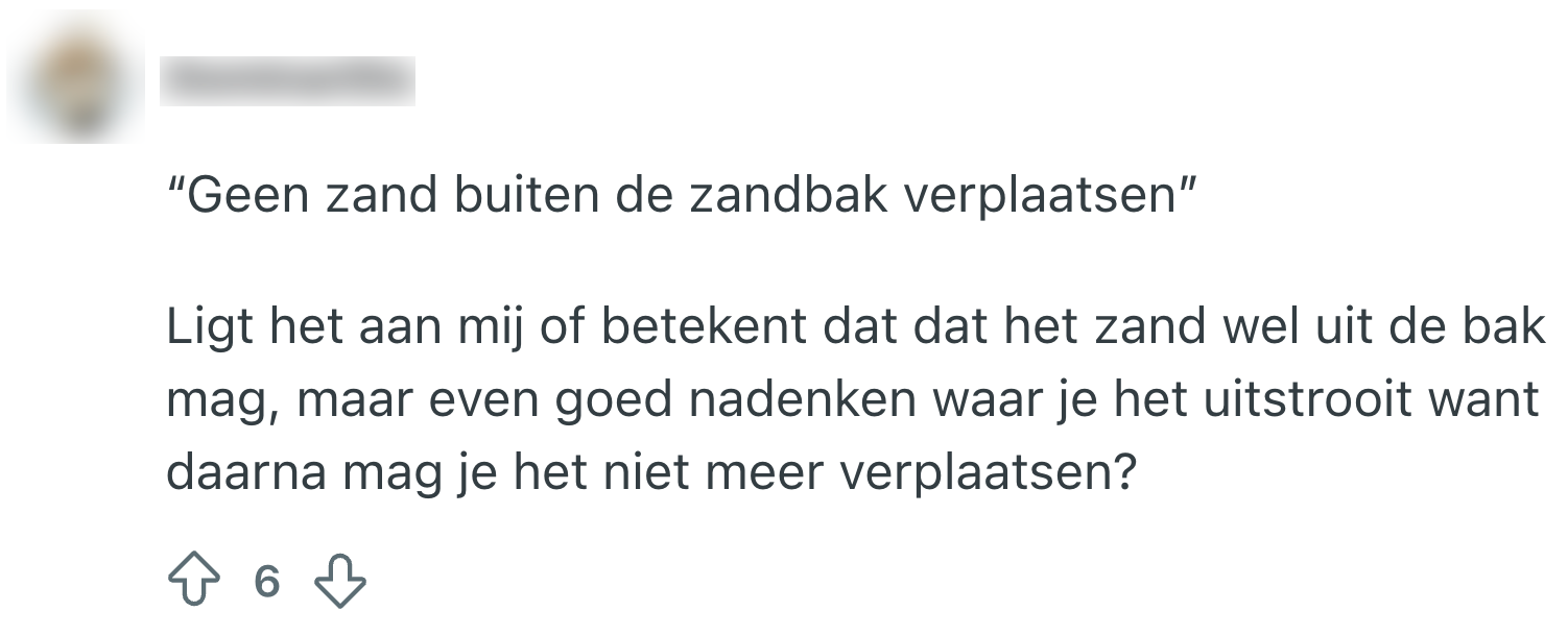 Het was vroeger misschien wel het mooiste wat er was: zonder zorgen de hele pauze keihard buitenspelen. Vooral als je in de zandbak mocht, was het feest. Van grote bouwwedstrijden tot moddergevechten na eenregenbui (waar je docent wat minder blij mee was). Vandaar dat er in sommige gevalen regels opgesteld moesten worden. Bij deze zandbak staat een bord dat de regels aangeeft, maar veel (volwassen) Nederlanders zetten de hakken in het zand.