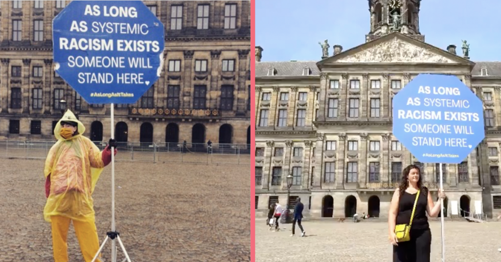 Elke week staan er 56 verschillende mensen ieder een uurtje op de Dam met een demonstratiebord, om te strijden tegen racisme. Dit doen zij ‘zo lang het nodig is‘. Vaak voelen mensen zich wat machteloos als het gaat om racisme, maar zo kan je toch iets bijdragen. Bovendien levert het nog interessante gesprekken op ook. Op het Instagramaccount @zolanghetnodigis verschijnen dagelijks foto’s van mensen die het stokje overnemen. De beelden bij elkaar maken een krachtig statement, en het roept mensen op om ook mee te doen aan de eenpersoons-estafette.