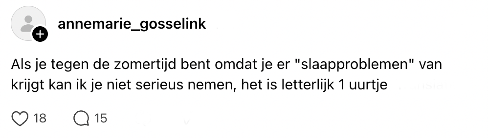 Het is weer zover. Je hebt het natuurlijk allang aan zien komen door alle klagende Gerda’s die er maar niet over ophouden hoe erg ze het uurtje slaap zullen missen en en van de daken schreeuwen dat de zomertijd eindelijk eens moet worden afgeschaft, maar gewoon voor de zekerheid: de zomertijd is weer ingegaan. Voor dat laatste moeten we nog effe wachten, dus de klok gaat alsnog een uurtje vooruit. Net als alle Gerda’s hebben ook andere Nederlanders daar iets over te zeggen.