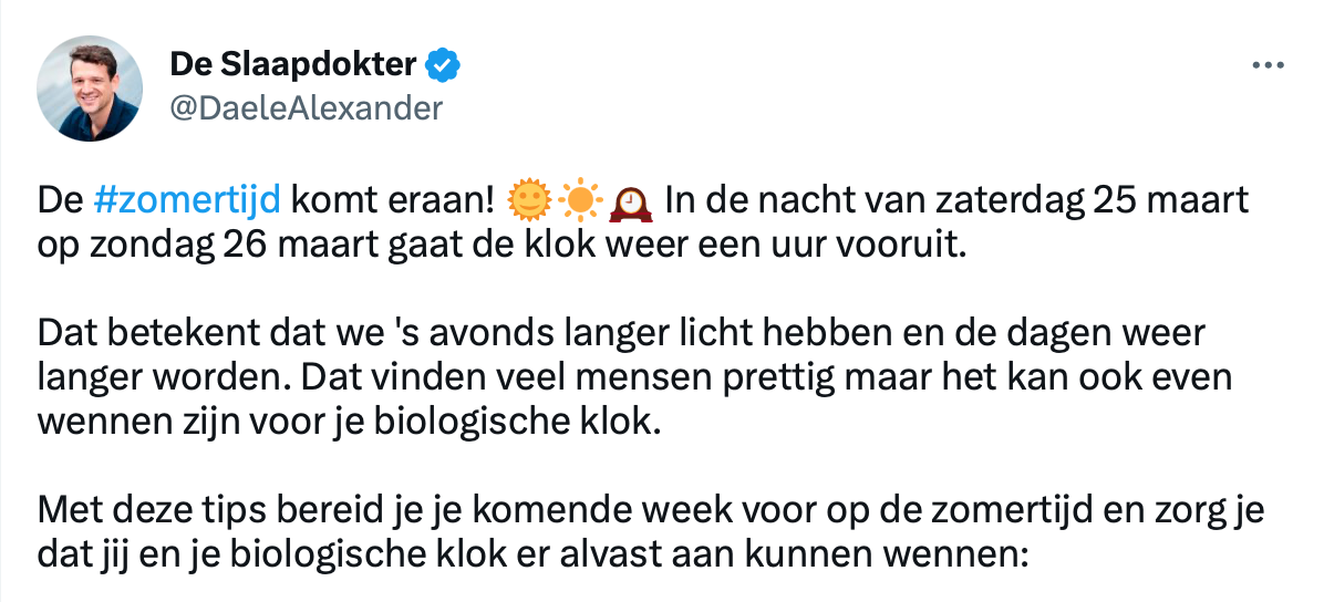 Zaterdagnacht zullen we allemaal weer een uurtje korter slapen want dan is het tijd om de klok te verzetten naar zomertijd. Ondanks dat veel van ons juist genieten van die lange dagen, slaat bij anderen de biologische klok flink op hol. Als dit laatste bij jou het geval is, dan heeft de slaapdokter zes tips om deze wisseling zo soepel mogelijk te laten verlopen.