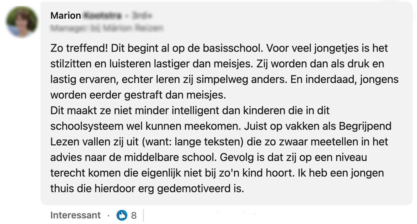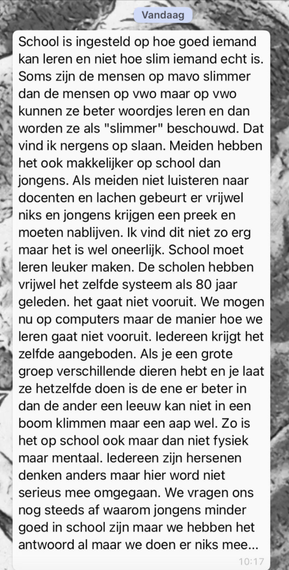 Toen zijn school aan de 15-jarige Troy vroeg om feedback te geven op het huidige onderwijs, twijfelde hij geen moment. Hij had al snel een verhaal klaar staan waarin hij, onderbouwd, vertelt wat er mis is met school. Zijn moeder Iris Meulendijks deelt het appje op LinkedIn, wat al snel veel reacties opleverde.