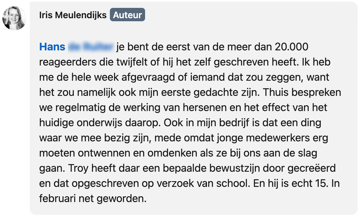 Toen zijn school aan de 15-jarige Troy vroeg om feedback te geven op het huidige onderwijs, twijfelde hij geen moment. Hij had al snel een verhaal klaar staan waarin hij, onderbouwd, vertelt wat er mis is met school. Zijn moeder Iris Meulendijks deelt het appje op LinkedIn, wat al snel veel reacties opleverde.