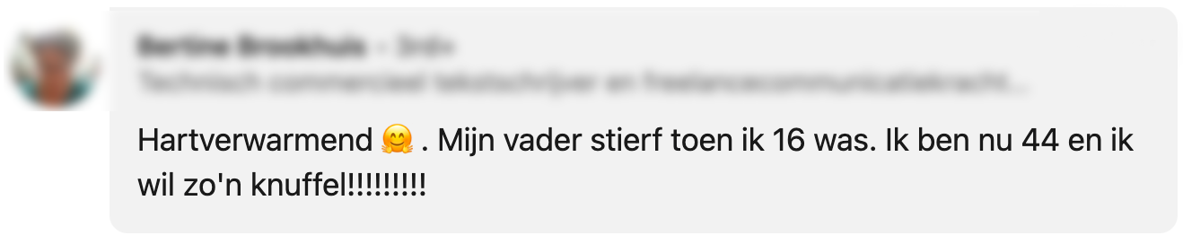 Het is september 2020. Op 51-jarige leeftijd verliest de man van Johanna zijn strijd tegen uitgezaaide melanoomkanker. Een moeilijke periode, voor zowel haar als haar zoontje. “Je probeer als moeder je kind zo goed mogelijk te helpen,” vertelt Johanna aan The Best Social Media. “Ik kwam op LinkedIn dit initiatief tegen en vroeg aan Luuk of hij graag een knuffel van zijn vader wilde. Dat leek hem heel mooi.”
