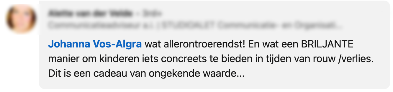 Johanna deelt het bericht dus op LinkedIn en al snel kan ze op duizenden mooie reacties rekenen. Velen vinden het cadeau geweldig en denken dat het erg kan helpen bij het verwerkingsproces.