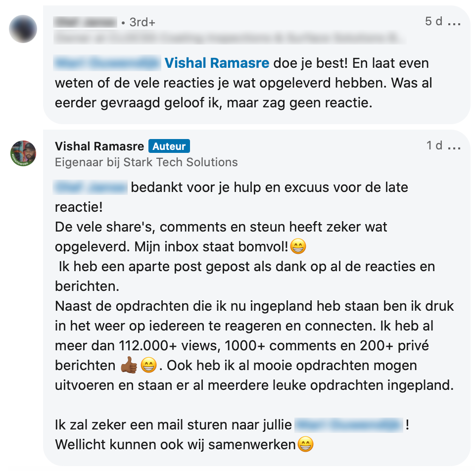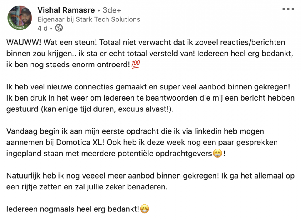 8. Tot slot deelde hij deze bijdrage op LinkedIn, om iedereen te bedanken voor de steun. We willen Vishal enorm veel succes wensen met zijn nieuwe projecten. Zet ‘m op!