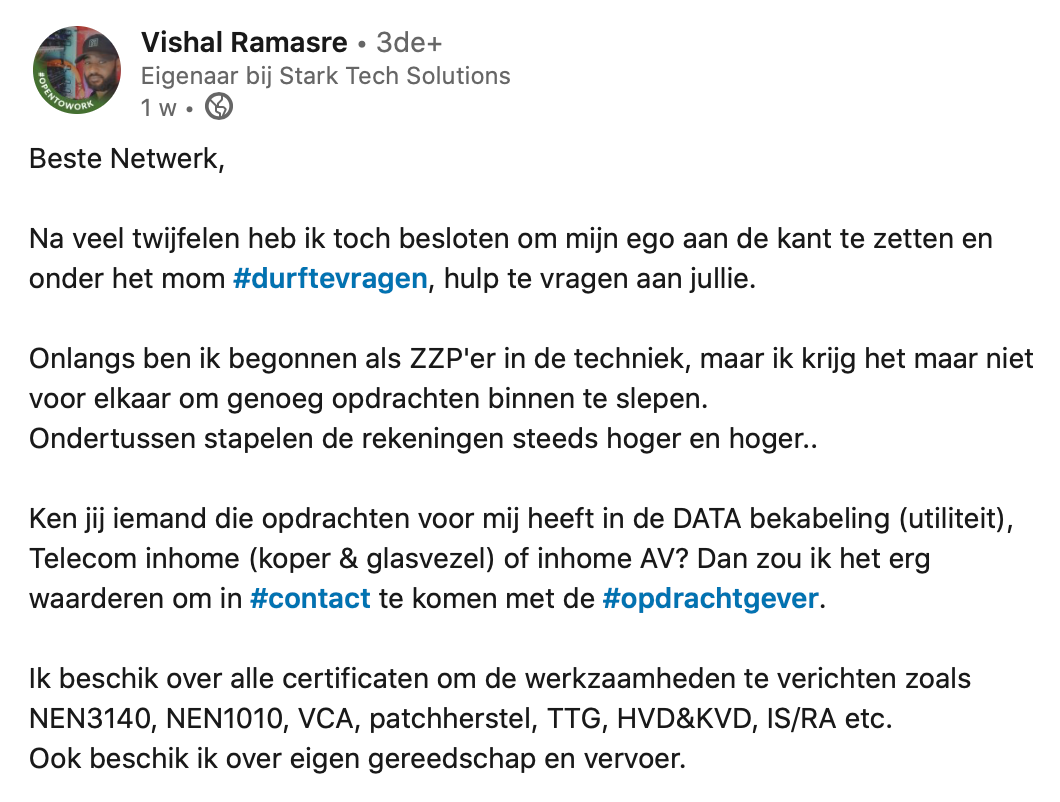 Aan werk komen in deze coronatijd is niet altijd makkelijk. Zo heeft verse ZZP’er Vishal Ramasre het ook lastig. In een dapper bericht op LinkedIn laat hij weten dat hij het lastig heeft en vraagt om hulp. Zijn netwerk springt bij en Vishal krijgt steun vanuit alle hoeken.